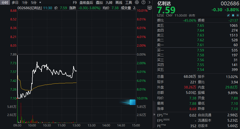 在停牌了4个交易日后,筹划控制权变更事项有了新进展的亿利达(002686)今日复牌,该股股价开盘后直线跳水,盘中一度触及跌停。截至午间收盘,该股收跌3.80%。