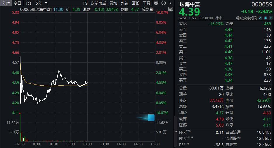 同样正筹划控制权变更的珠海中富(000659)也于今日复牌,该股股价盘中大幅调整,一度跌超8%。