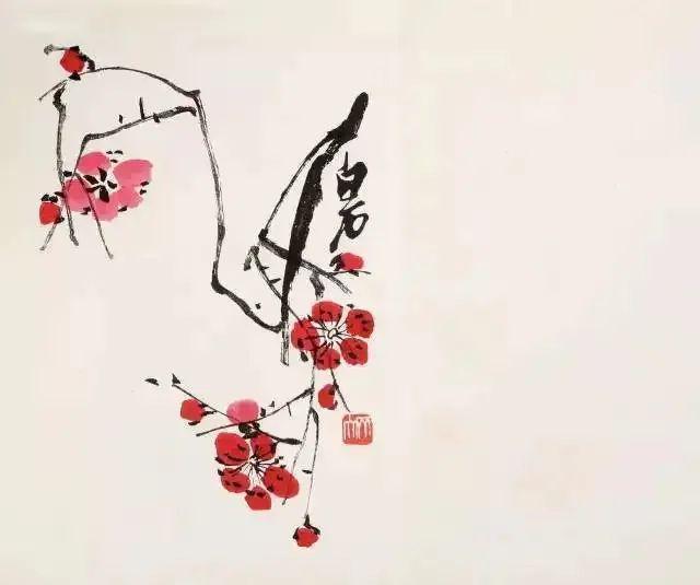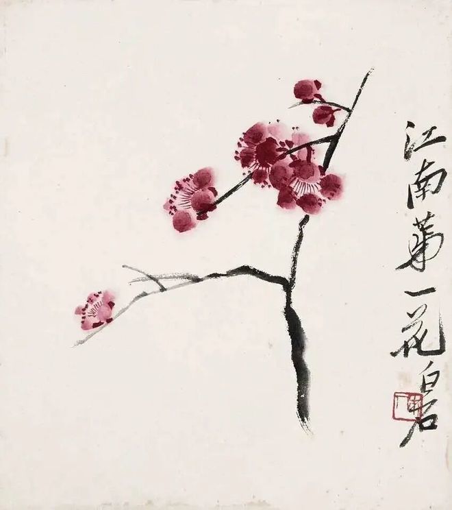 齐白石对梅花形态高度概括提炼,简化为基本几何形状,以简洁富有表现力线条勾勒。枝干表现夸张,粗壮枝干有力挥就,梅花花瓣简洁点染,看似随意却恰到好处表现出神韵。